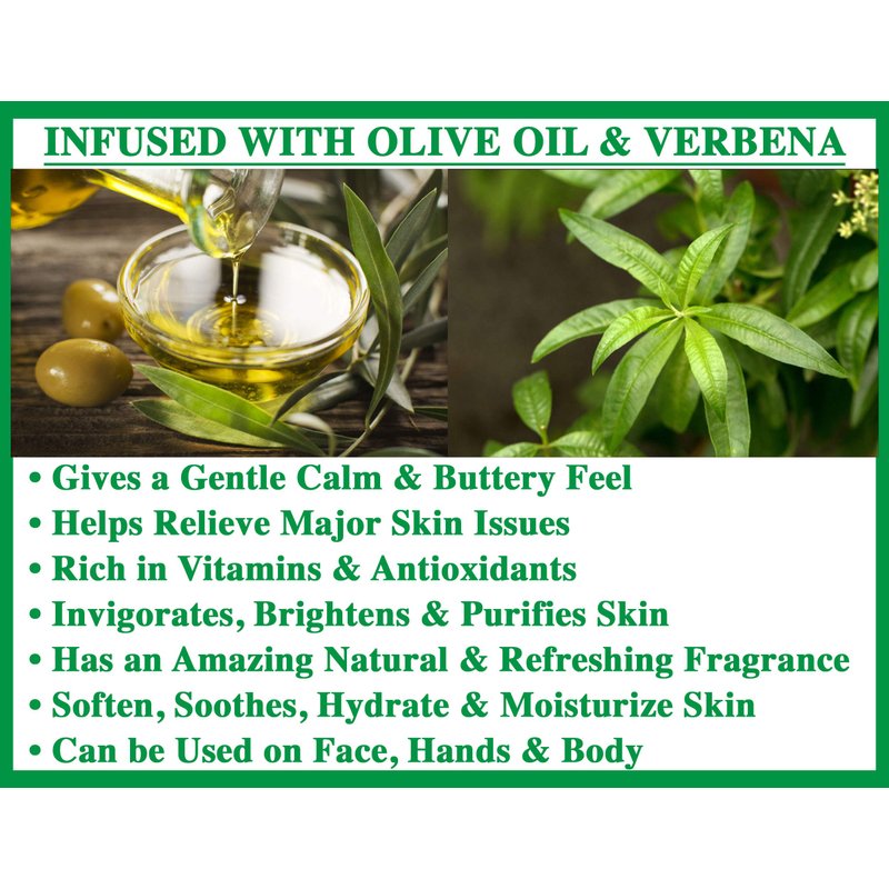 - ✅ INFUSED WITH OLIVE OIL & VERBENA: Olive oil is known to be a perfect skin Moisturizer and gives a very clean and buttery feel. It gives a very gentle and clean feel to skin and help in relieving Eczema and Psoriasis and Acne. Verbena in Soap is known to Purify, brightens and helps in treating Puffiness of the skin and provides a nice scent.