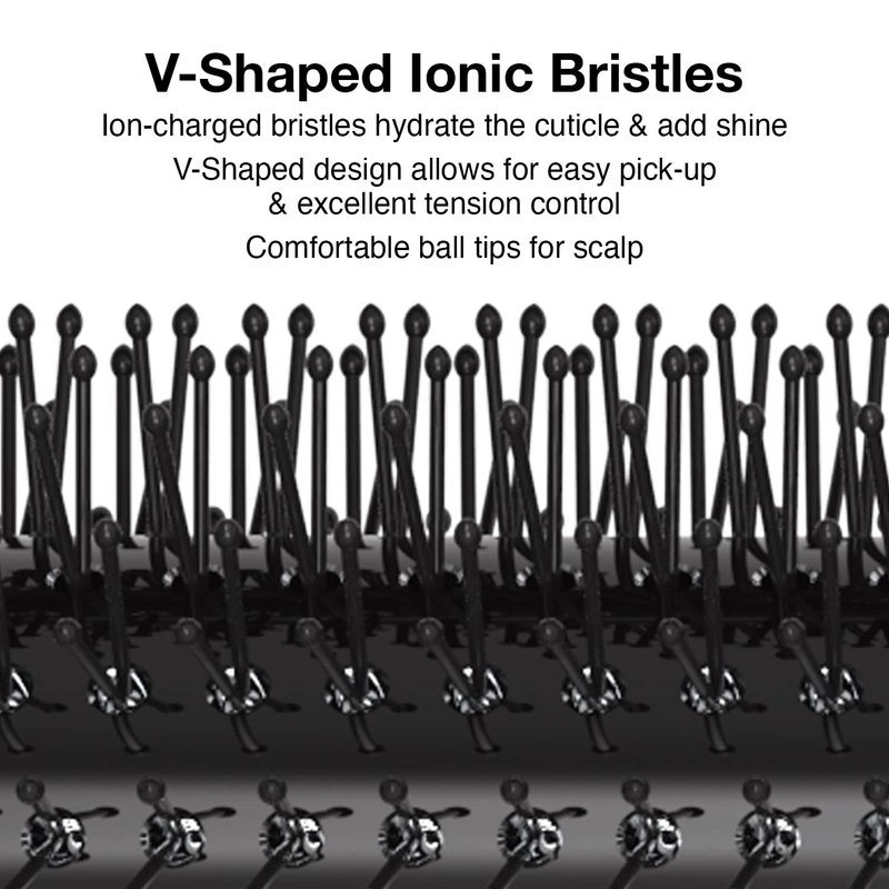 Round ceramic coated barrel quickly heats up (from heat of the dryer), shapes the hair and reduces the drying time. V-shaped bristles with comfortable ball-point tips easily pick up short hair while providing excellent tension and grip making it easy to create volume, shape or direction. Ergonomic anti-slip rubber handle for perfect grip and effortless rotation. Ionic technology adds more shine to the hair and eliminates frizz and flyaways. Retractable sectioning pick.