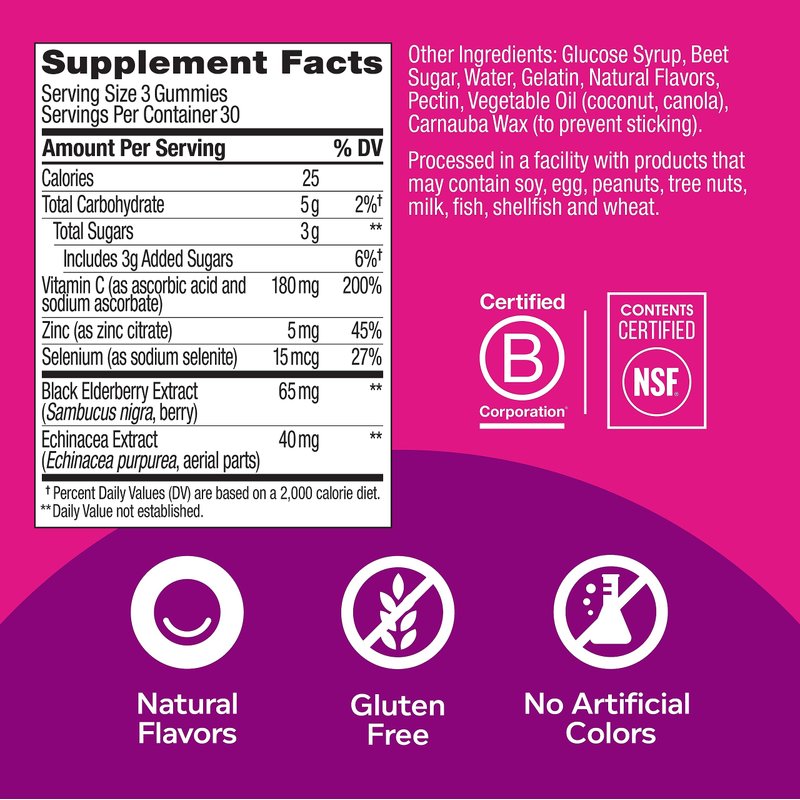 - THE GOODS INSIDE: A superstar blend of Elderberry, Echinacea, Vitamin C and Zinc help keep your immune system running strong. Elderberry has been used for centuries to support wellness and packs a powerful punch of phytonutrient plant power*