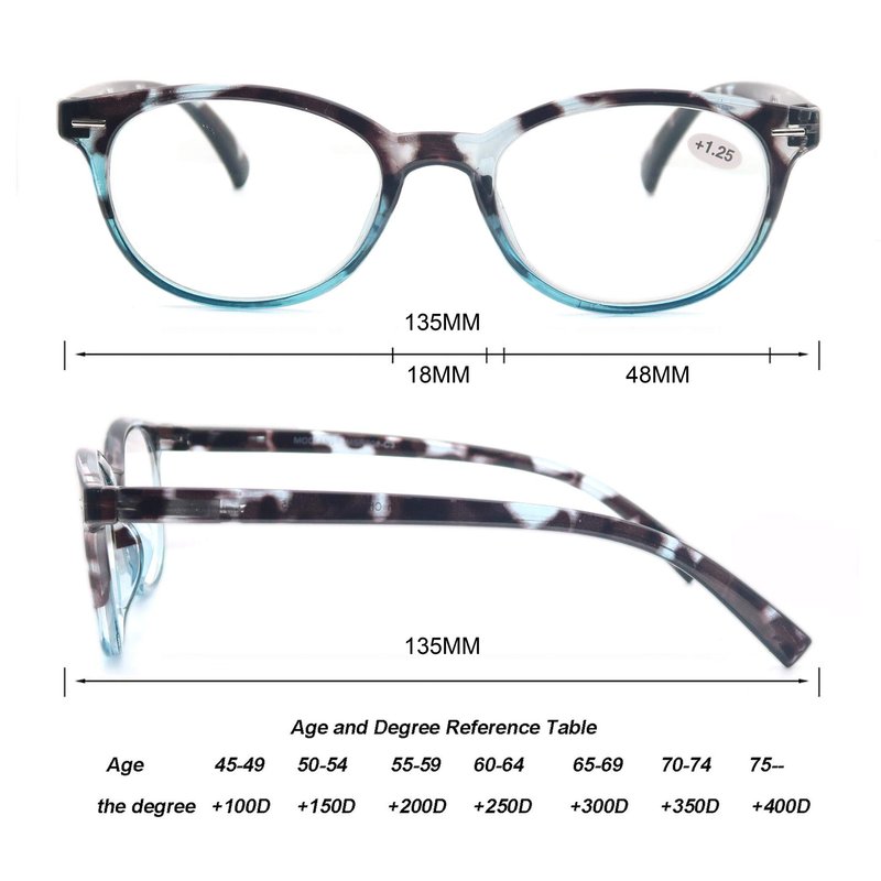 - [3 Blue Demi Reading Glasses]-Lens width:1.9in,Bridge width:0.6in,Arm width:5.4in. 1 PCS womens reading glasses is 22g/0.066lb.Resin aspherical lens, no distortion.