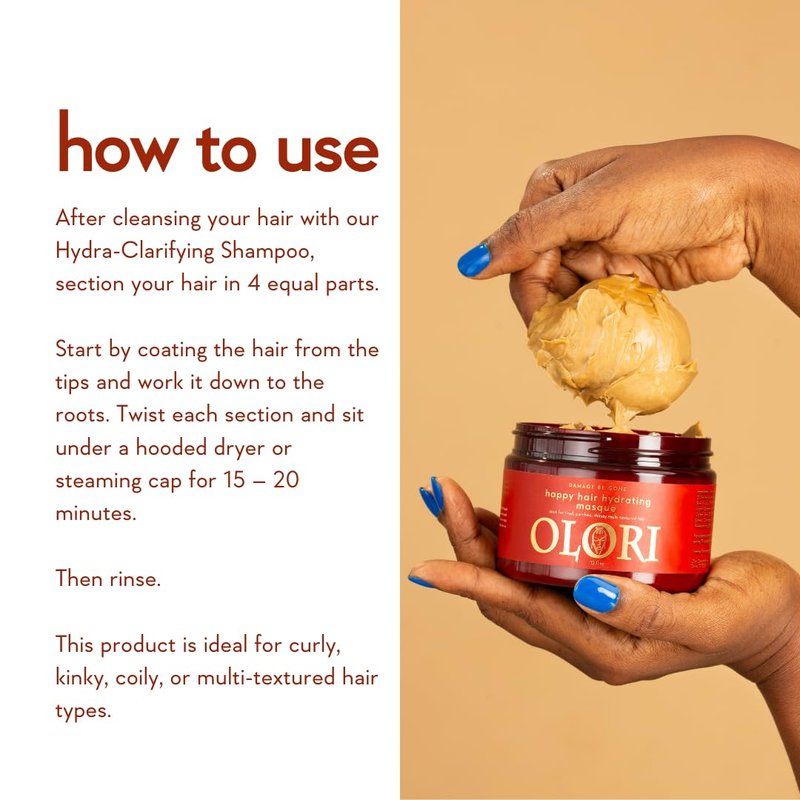 - For Best Results - After cleansing Olori Hydra-Clarifying Shampoo, section your hair in 4 equal parts. Start the treatment from the tips of your hair and work it down to the roots. twist each section and sit under a hooded dryer or steaming cap for 15 – 20 minutes. Then rinse. For best results. apply a small amount of our Happy Hair Butter Pomade while hair is still damp for an intense scalp treatment. use 1x per week.