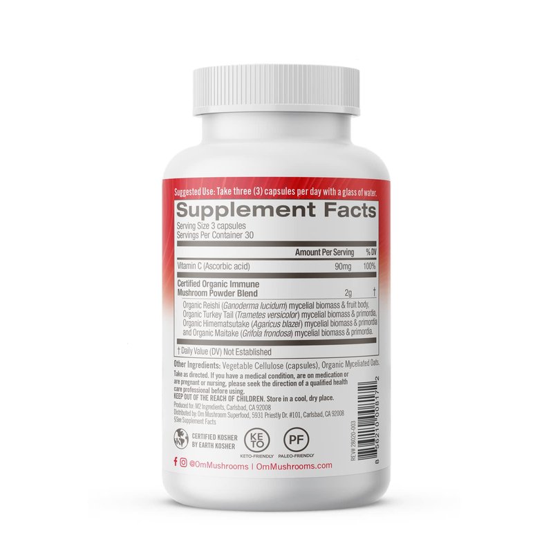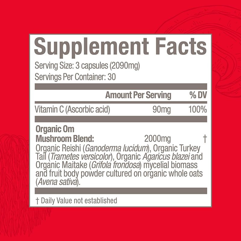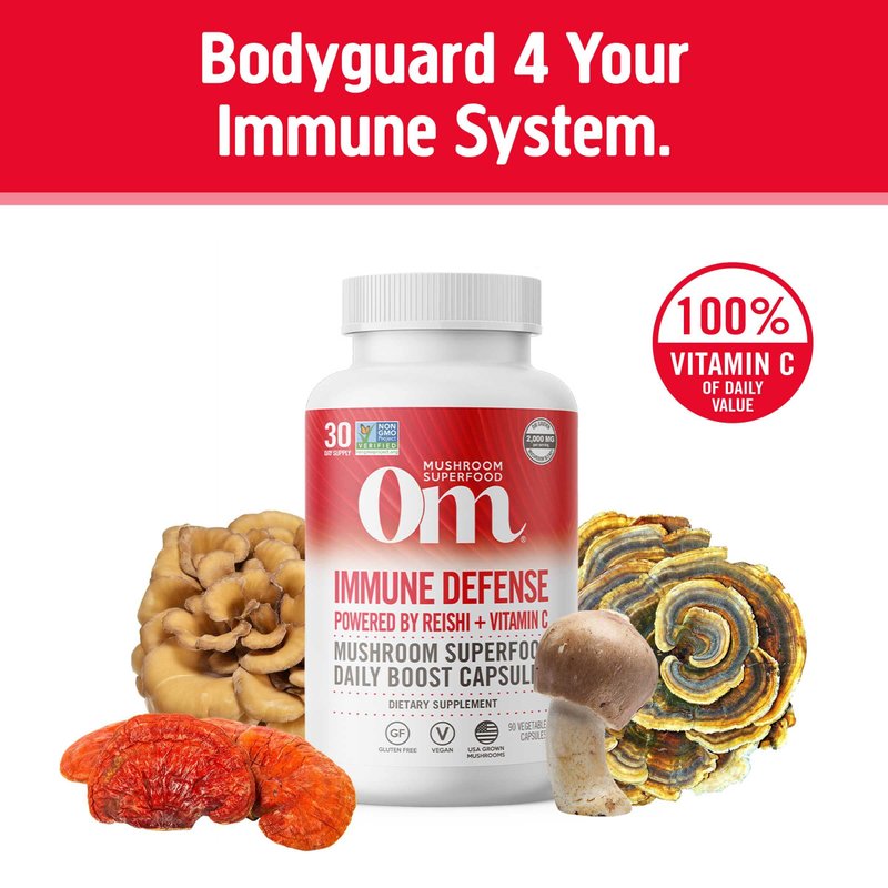 Om Mushroom Superfood Immune Defense Mushroom Capsules Superfood Supplement, 90 Count, 30 Days, Mushroom Blend, Reishi, Turkey Tail, Maitake, Agaricus Blazei, Vitamin C, Vegan