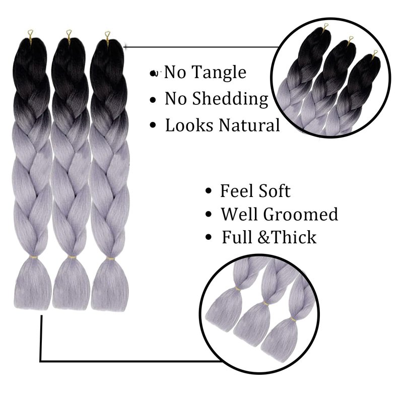 Ombre Braiding Hair Extensions 3 Pack/24 Inch Color Braiding Hair Fiber Crochet Hair for Box Braids Senegal Twist Hair Extensions for Women and Girls (24 Inch, Black/Gray)