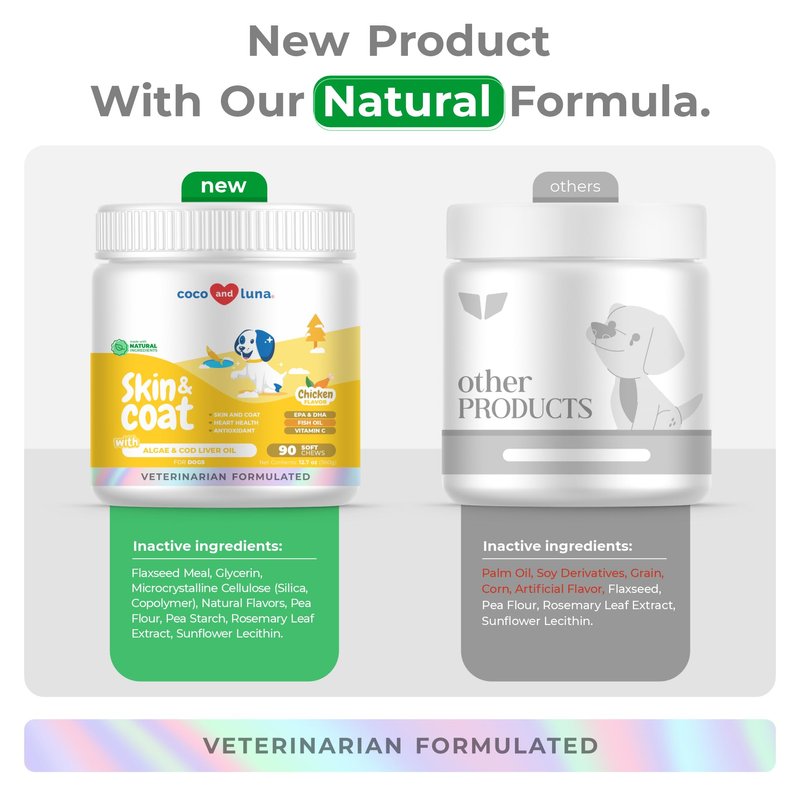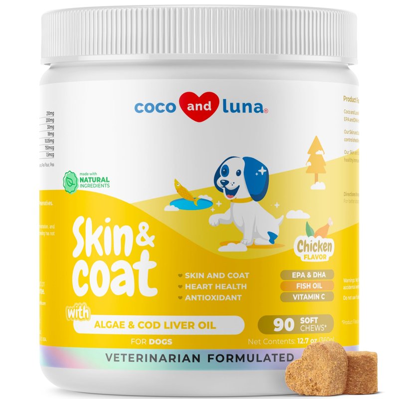- Coco and Luna Skin and Coat Support for Dogs with Fish Oil and Algae Oil provides essential fatty acids for a vibrant coat and healthy skin.