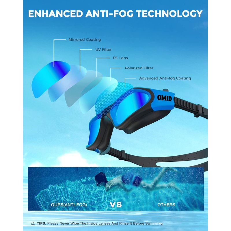 OMID Kids Swim Goggles, P2 Comfortable Polarized Unisex-child Swimming Goggles, Anti-Fog No Leaking Swim Goggles with UV Protection Age 6-14 (Black Blue)