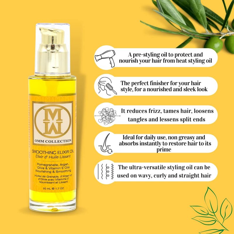 OMM Collection Elixir Oil Hair Smoothing Styling Heat Protection Frizz Control With Pomegranate Argan Olive Oil. Protects Dry Damaged Hair