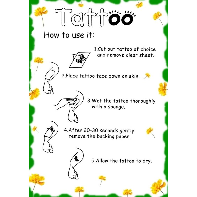 - 1. Cut out tattoo of choice and remove the transparent film. 2. Place tattoo face down on skin. 3. Wet the tattoo thoroughly with a sponge or towel. 4. After 20-30 seconds, gently remove the back paper. 5. Allow tattoo to dry.