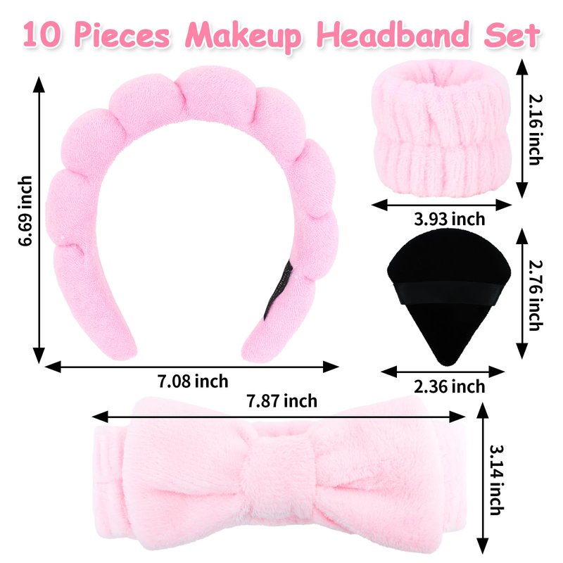 Ondder 10 Pcs Spa Headband and Wristband Set with Poder Puffs Spa Headband for Washing Face Makeup Headbands Pink Bubble Headband Skin Care Face Wash Sponge Puffy Head Bands Headband for Women Girls