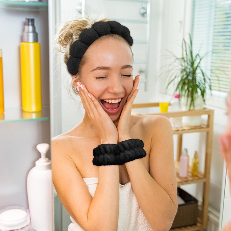 - Durable: The spa set include 1 x black bubble headband, 1 x black terry cloth headband, 1 pair of black wristbands, and 1 pair of black hair scrunchies. You can share these headband with your family and friends.