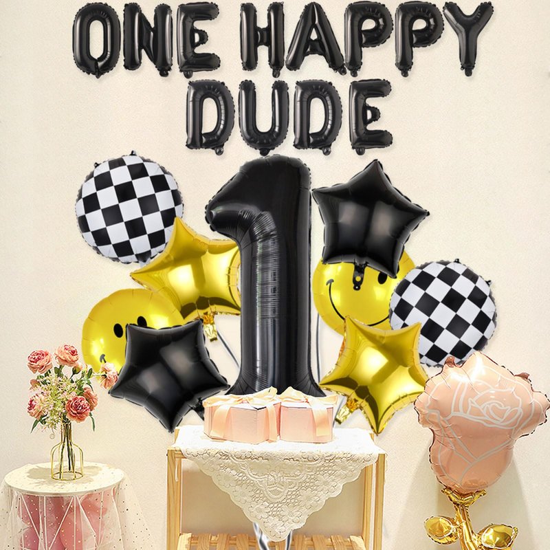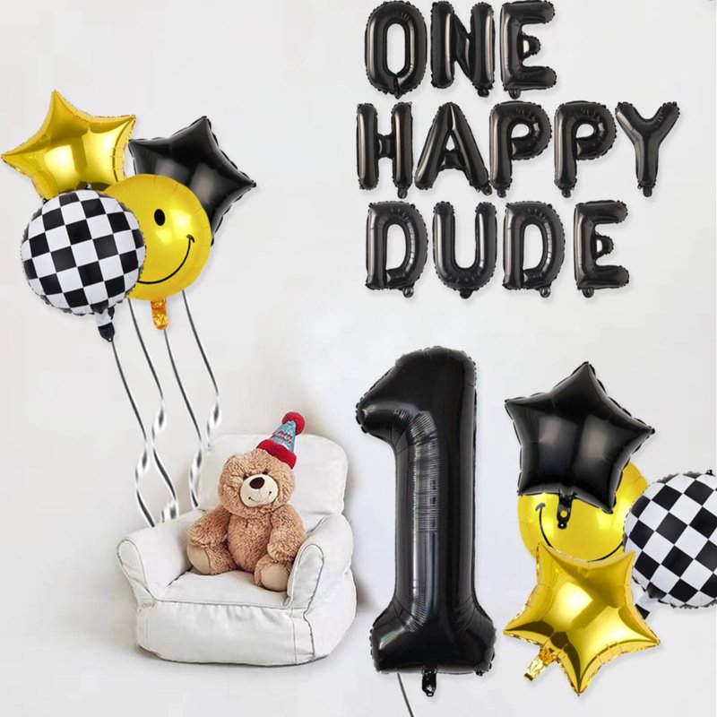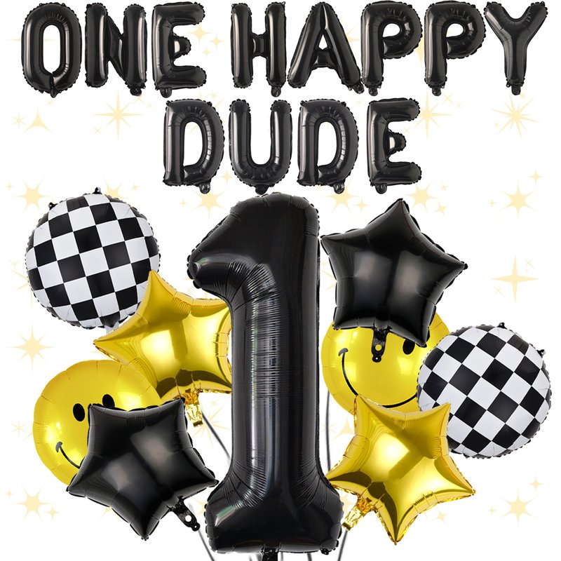 - GREAT PACK FOR 1ST BIRTHDAY DECORATIONS | CUTE ONE HAPPY DUDE: Package comes with 14pcs balloons : 1pcs 40” number 1 balloon, 12pcs 16" Letter balloons: ONE HAPPY DUDE, 2pcs 18" checkerd Balloons, 2pcs 18 " smile face balloons, 2pcs 18 " black star balloon and 2pcs 18" gold star Balloons. Whether you're throwing a ONE HAPPY DUDE themed party decor at your little one’s birthday, these balloons set are sure to make a statement.