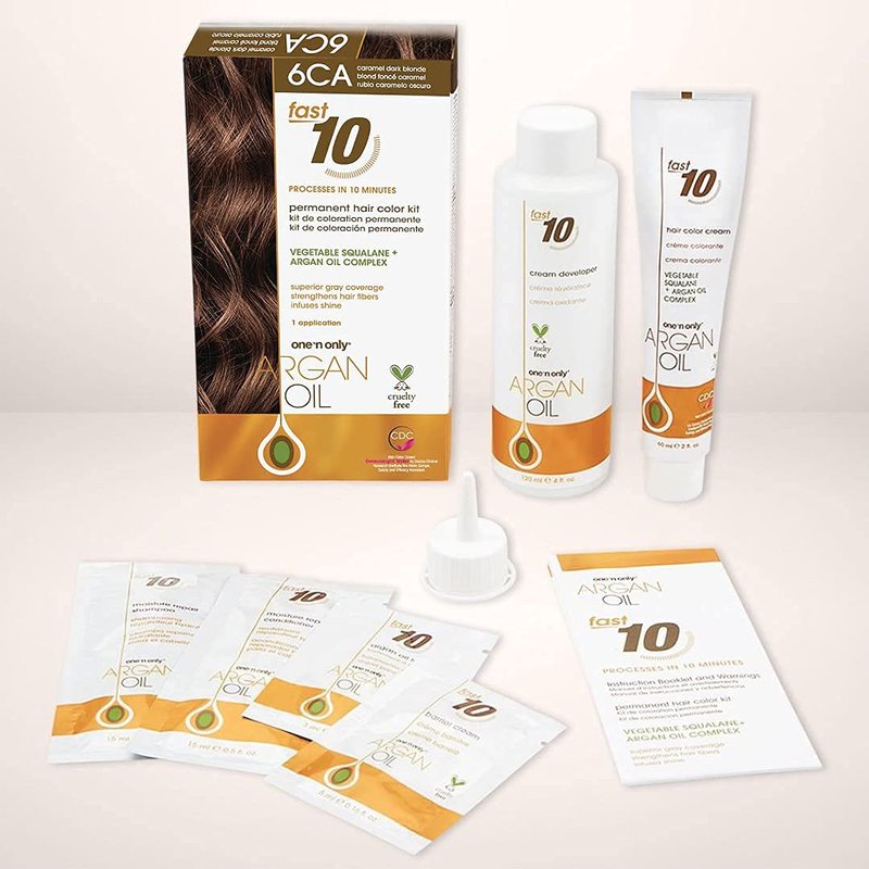 One 'n Only Argan Oil Fast 10 Permanent Hair Color Kit 6CA Caramel Dark Blonde, Gray Hair Coverage in 10 Minutes, Helps Maintain Natural Moisture Balance, Advanced Micro-Pigments for Natural Tones
