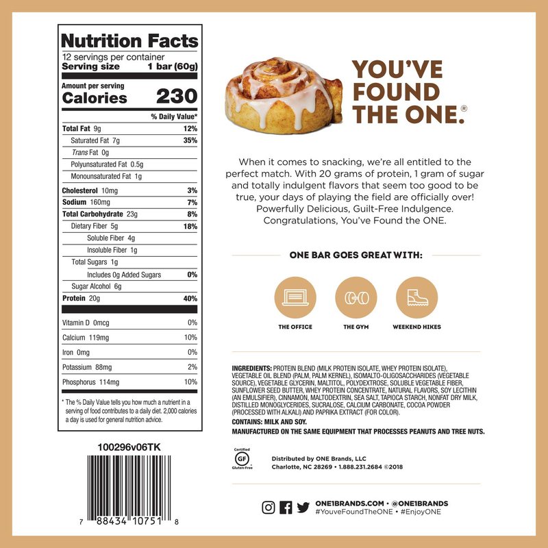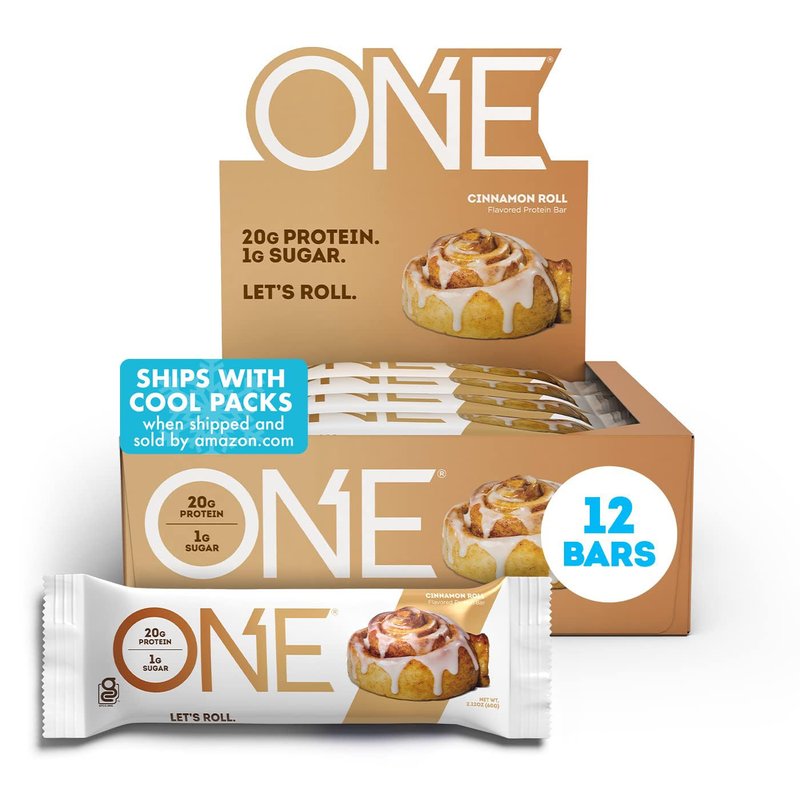 - THE ONE PROTEIN BAR: Congratulations, You've Found the ONE. Protein bar, that is. Craving that freshly baked cinnamon roll flavor for breakfast, With our Gluten-Free Cinnamon Roll you get 20g of protein and 1g of sugar, so go ahead and take a bite.