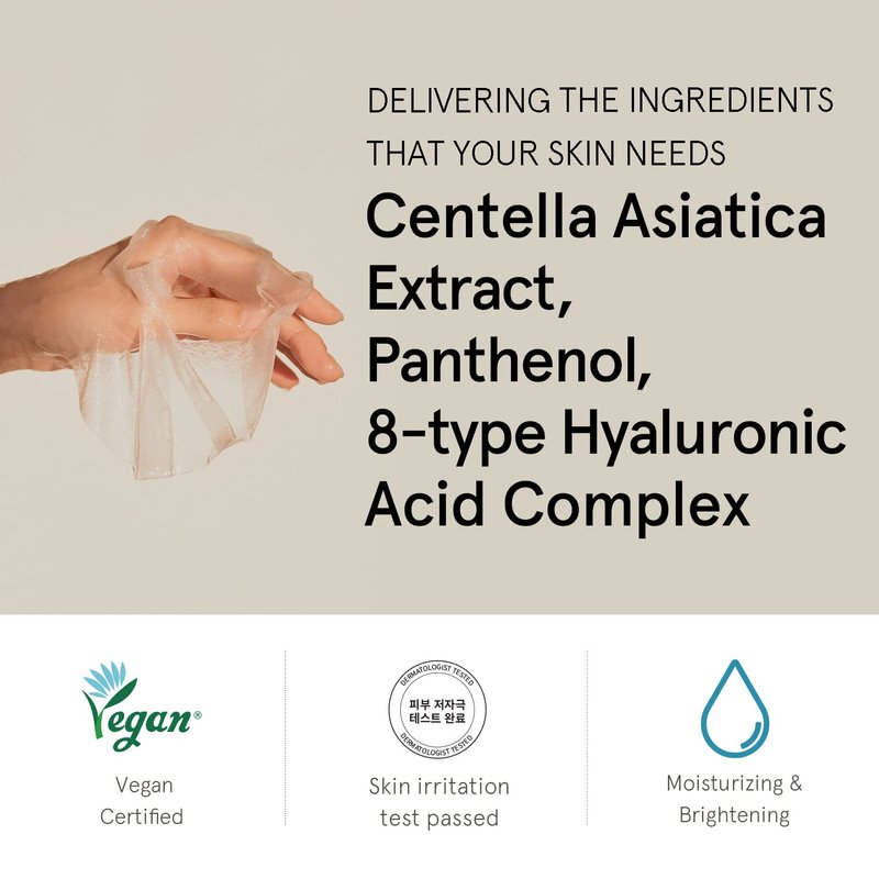 Centella helps to lock in moisture and improve skin texture giving skin a smooth and lively look. Formulated with 8 kinds of Hyaluronic Acid, Panthenol and Beta-glucan, this mask helps to soothe irritated skin, form a moisturizing film and improve skin radiance.