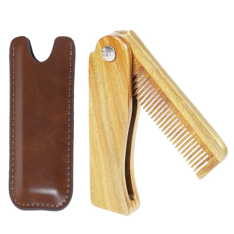 Onedor Handmade 100% Natural Green Sandalwood Fine Tooth Wooden Comb for Men Hair, Beard, and Mustache Styling Pocket Comb With Leather Case (Folding)
