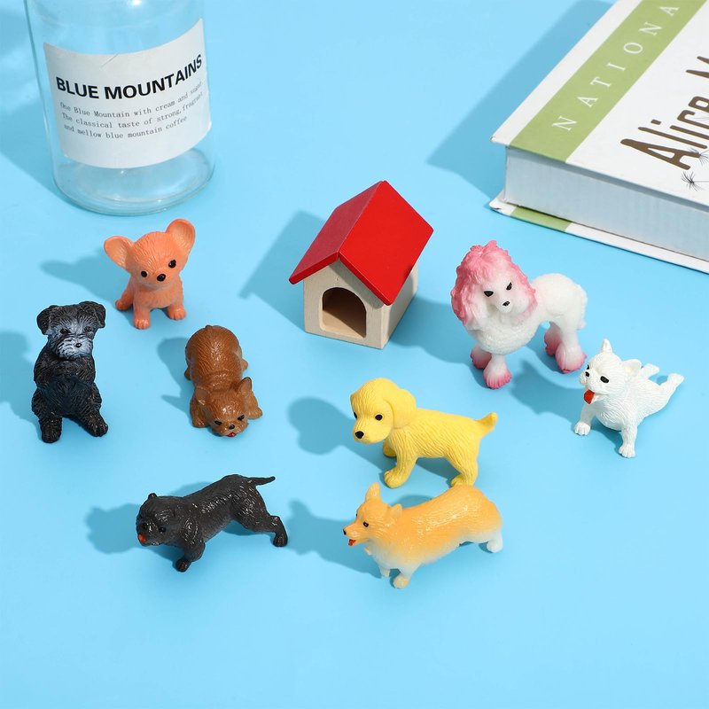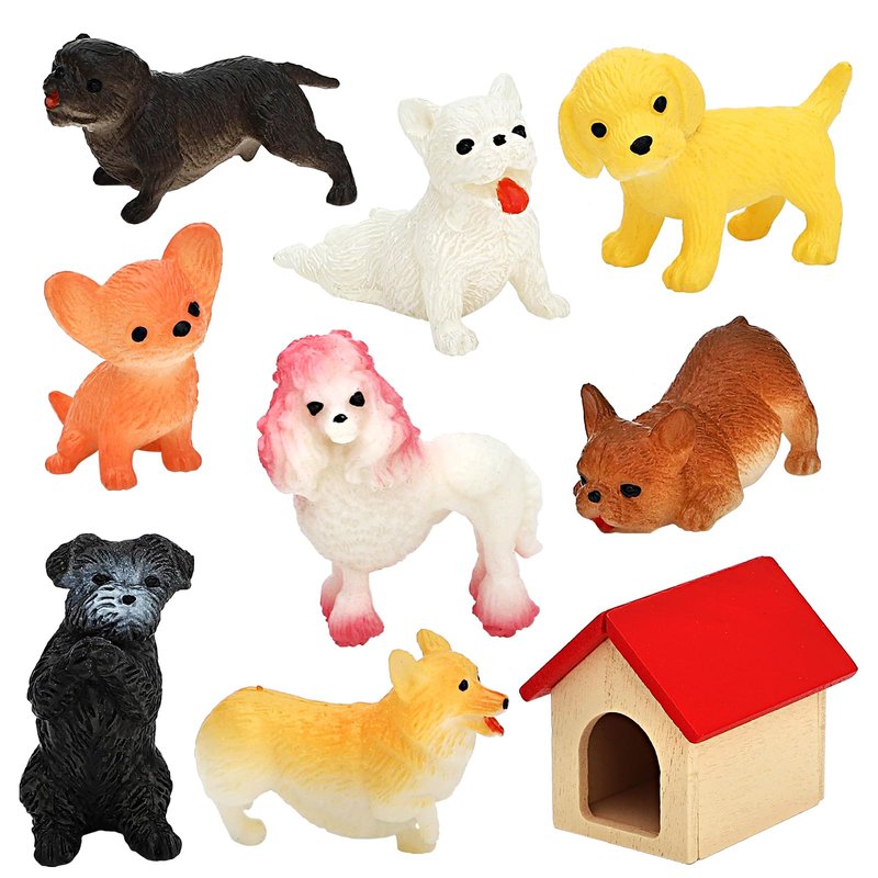 - What you get: 8 pieces vivid puppy figures in different styles, different dog as showed in picture, from 1 inch to 2inch in length, a dog house for them to live