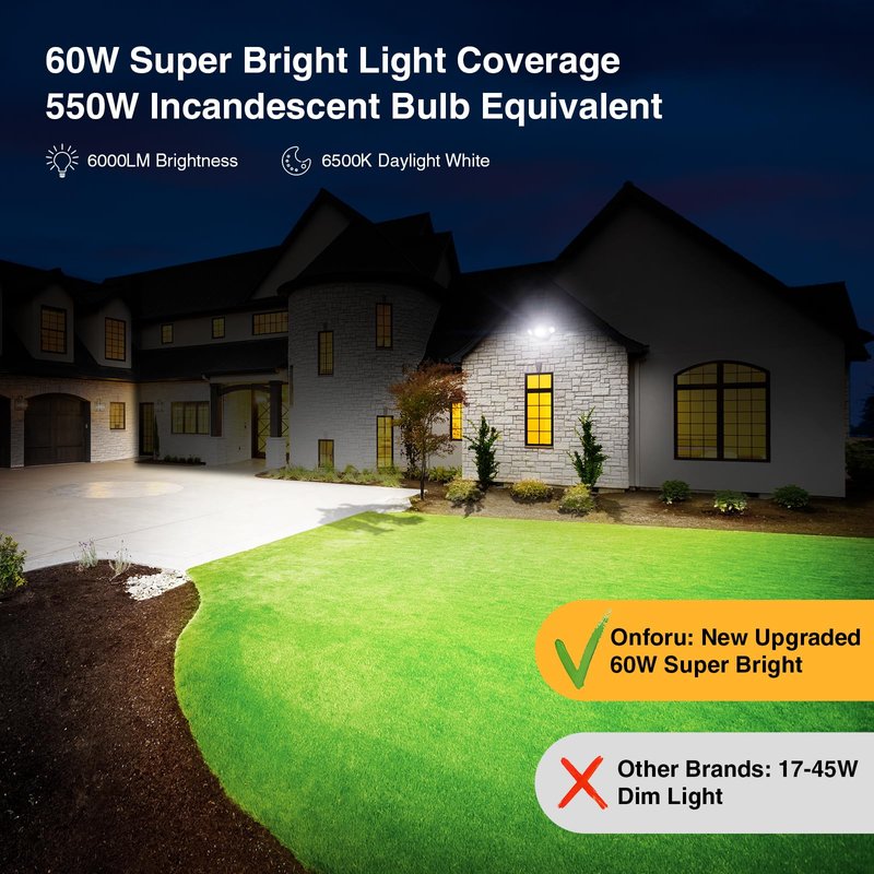- 【60W SUPER BRIGHT SECURITY LIGHTS】Each 60W outdoor dusk to dawn lights comes with 112 LEDs, producing up to 6000lm high brightness. Brighter than other 35w security light. With advanced high-efficiency LEDs, saving 80%-90% on electricity bills. Note: This is Not a Solar Light. No Motion Sensor.