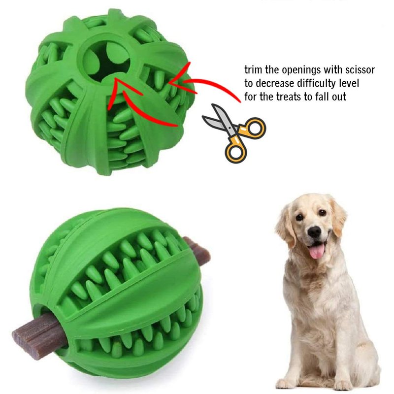 Treat Embedding Ball Toy (Dog treats are not included.)This dog ball is made from environmentally safe material and use an extra elastic rubber that is designed to stand up to substantial chewing. It provides interactive fun that will entertain and challenge any dog keeping them coming back for more time and time again. It is designed with raised surface that help clean your dog’s teeth and massage their gums. The IQ ball has a scent of vanilla that will help to freshen your dog’s breath while offering them something better to chew on other than your furniture. If the toy you’ve purchased from us does not last as long as you thought it should or if your dog shows no interest, simply contact us and we are here to help. We want your furbaby to enjoy playing the toy and keep their owners happy.. Size Chart – Two different sizes to choose from. Good for small, medium and large dogs. Small Size is 2 inches, it is about 0.25 inches bigger than the size of the golf ball. We recommend using extra tiny treats with width smaller than the size of regular kibble, semi-soft so it’s easier to break into smaller pieces or use kibble sizes that are made for mini or small breeds.The center of the iq ball is designed to hold small size dental chew sticks or bully sticks for prolong playing time Large Size is 3 inches – similar to the size of a baseball. We recommend using training treats or use regular kibble size as stuffing. The center of the iq ball is designed to hold small size dental chew sticks for prolong playing timePick a size that’s larger than the width of your dog's mouth, proper supervision is advised when playing with all toys to ensure no accidental swallowing. Use as a interactive mental stimulation treat rewarding toy. “Not recommended for strong aggressive chewers"