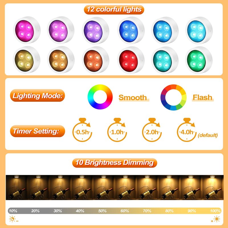 - ▶Tap On/Off Lights: Tap on the face of puck light to activate it or change light color or light modes. You’ll also turn it off with a long press. For long distance with remote control.