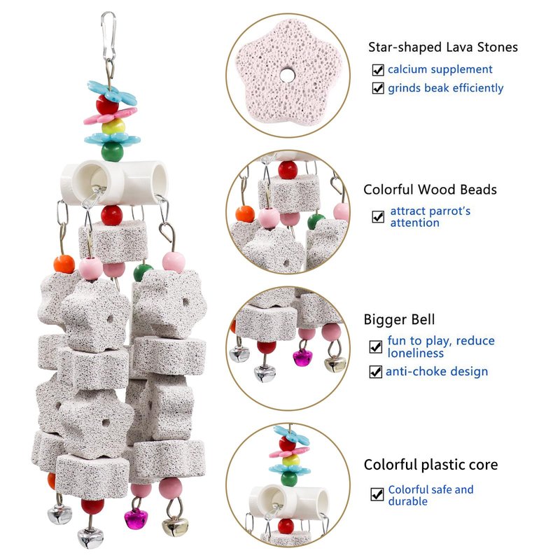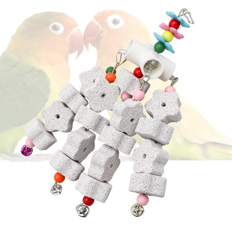 - Impeccable Design: Each bird chew toy comprises 17 star-shaped grinding stones, accompanied by a small bell attached to the end of each stone string. While birds chew, the bells produce a delightful tinkling sound.