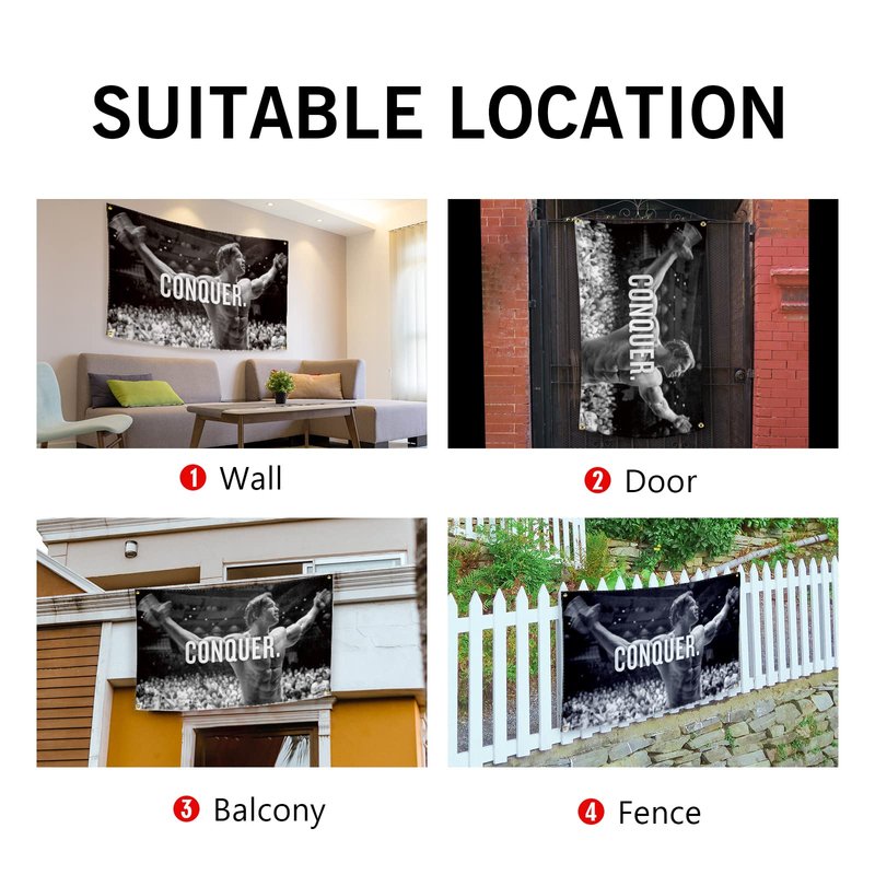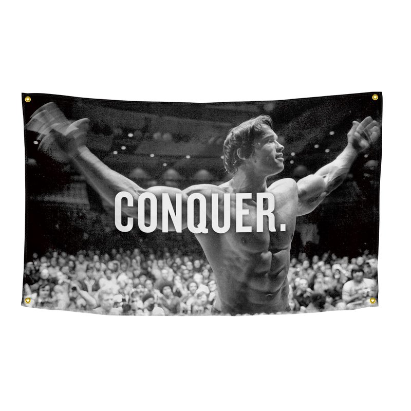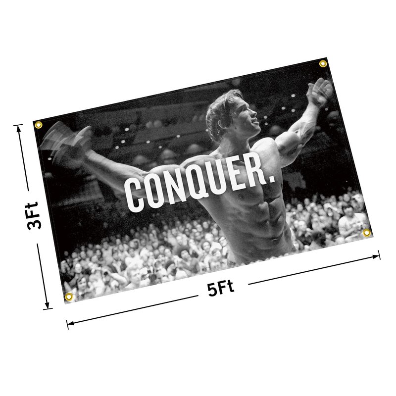 OOOYIY Conquer Flag for Arnold Schwarzenegger 3×5 Feet Funny Poster Banner Wall Outdoor Hanging Flag with 4 Brass Grommets for College Dorm Room Decor