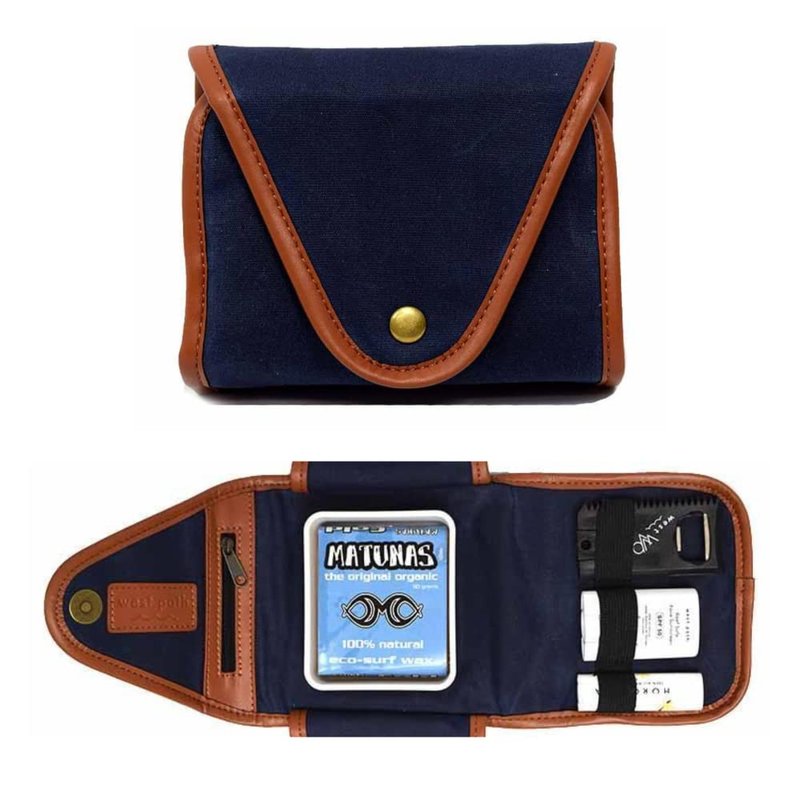 It's the simple things in life that often make the biggest difference. Like when you're about to head out for a day on the ocean, it's nice to know you have all your essentials organized in one neat Surf Travel Kit. No hassle, no mess, and no scrambling around in the dark for 20 minutes to find your wax or sunscreen...Instead, everything is neatly tucked away in its own space, neatly organized in a handy and stylish clutch that fits easily in the glovebox of your car. (dimensions: 7" long x 4.2" tall x 1.8" wide) Leave the digging for wax and sunscreen to the newbies, get more time in the ocean, and more happy vibes with our Surfer Gift Set. Currently offered with a free organic coin pouch while supplies last :).