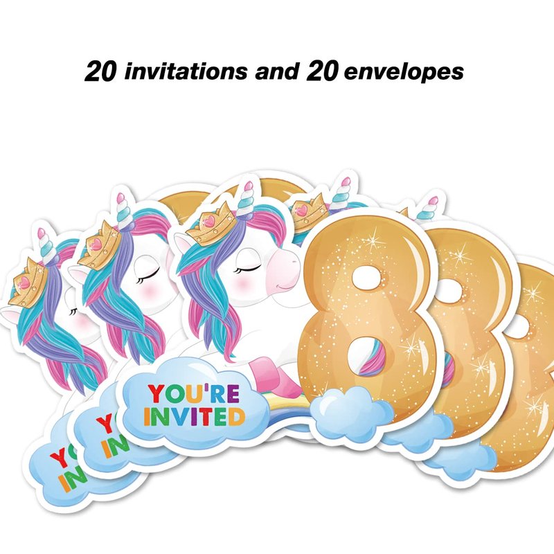 Opomzk Cute Unicorn 8th Party Invitations with Envelopes, 20 Set Unicorn Eight Shaped Invitations Eighth Birthday Girl Kids Party Invites Supplies Favors, Double-Sided