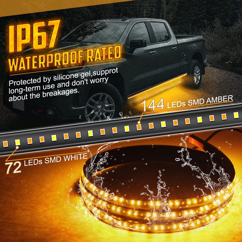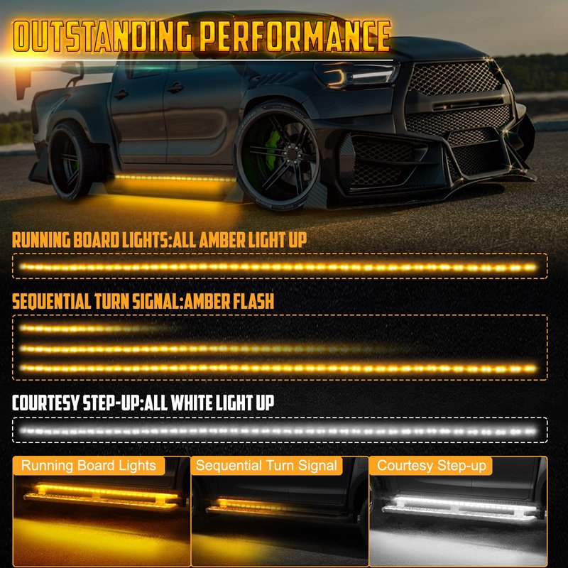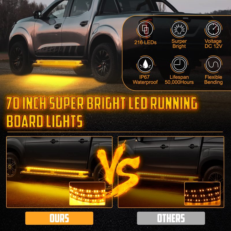 - 1.✔【Ultra-Brightness Running Board Lights】2PCS 70'' led running board light equipped with 216 LEDs(144 amber leds,72 white leds),provide super bright lighting output,72 LEDs of white for door/step/DRL/parking lights and 144 LEDs of amber color for sequential turn signal lights.