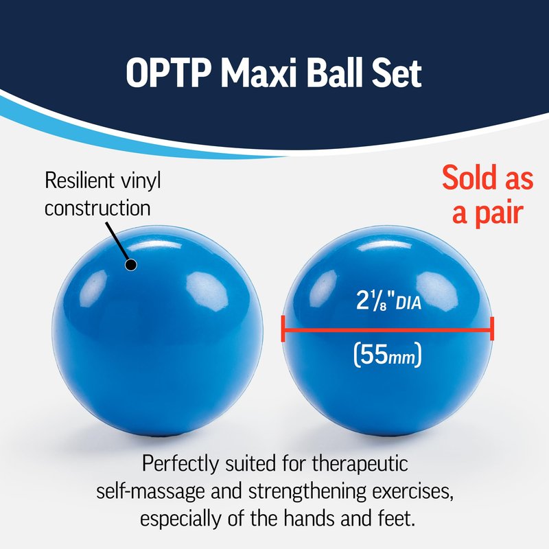 Perfectly suited for therapeutic self-massage and strengthening exercises, especially of the hands and feet. Build grip or finger strength and improve dexterity after an injury. Develop motor skills. Perform self-massage to relieve tension, rehydrate and mobilize connective tissue and soften scar tissue. Unlike a spike ball or a pressure point ball, these soft massage balls can be used as a foot massager ball, pt ball, a fascia ball, a myofascial release ball, an exercise ball for hands, a plantar fasciitis ball for foot massage, and a foot roller ball. Soft and flexible yet resilient vinyl construction. Maxi Balls measure 2.13" (55mm) diameter. Sold as a pair.
