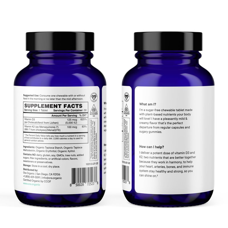 Ora Organic Vitamin D3 2000IU - Vegan Vitamin D Chewables from Lichen for Bone Health, Immune Support, & Mood | Maximum Absorption - 1 Month Supply, 30 Vegan Chewable Vanilla Tablets