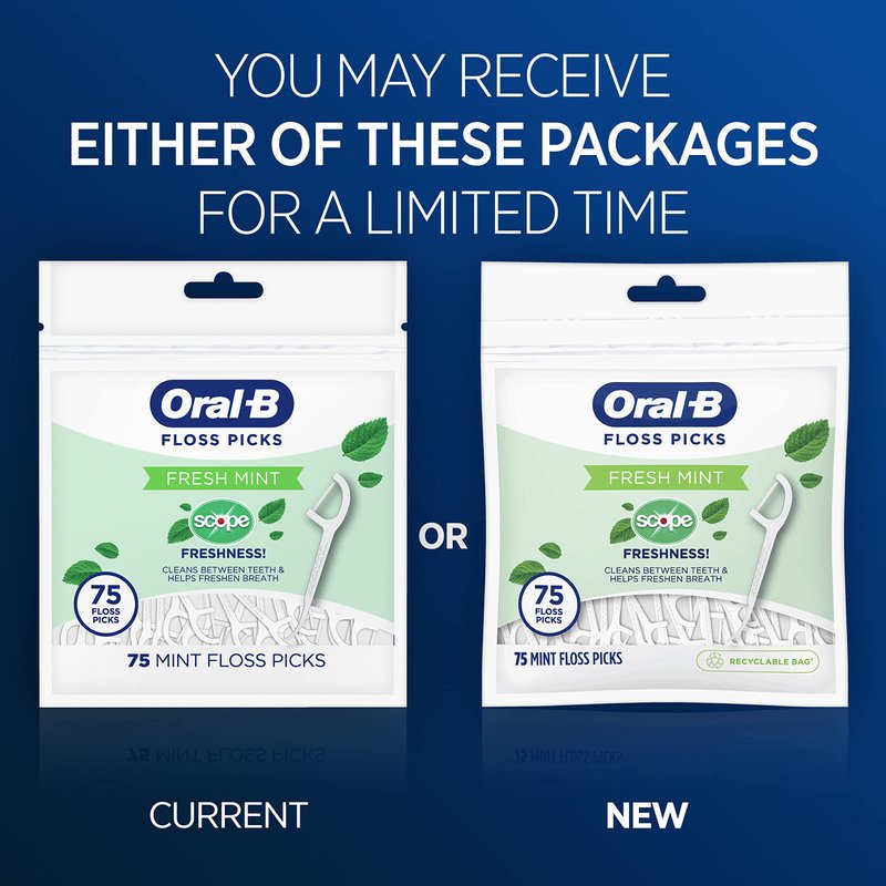 - You will receive (6) 75 count bag of Oral-B Burst of Scope Floss Picks, Fresh Mint flavor (450 Floss Picks Total)