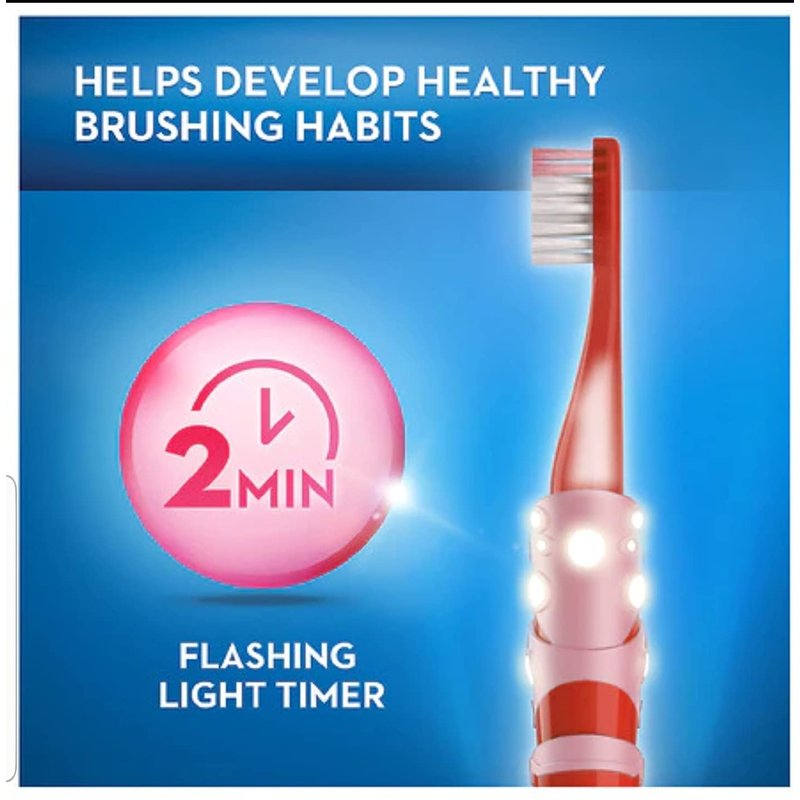 - Light up timer flashes for 2 minutes, indicating how long kids should brush each row of teeth