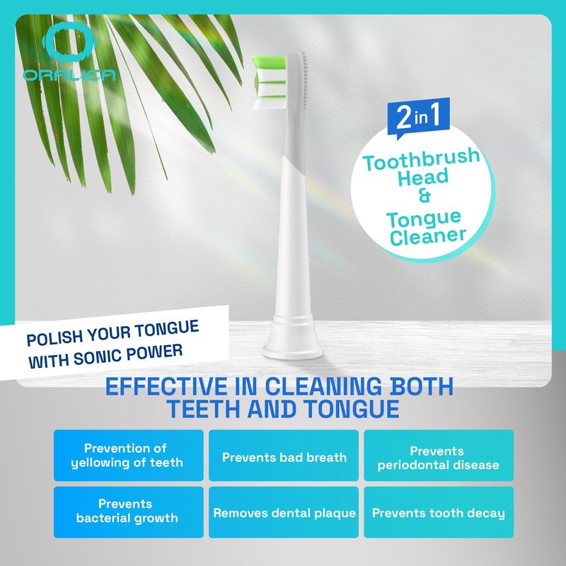 Elevate Your Oral Health with Oralica's Compatible for Philips Sonicare Replacement Toothbrush Heads Experience the perfect blend of functionality and affordability with Oralica's replacement toothbrush heads, designed to fit a variety of Philips Sonicare click-on electric toothbrush handles. Our pack of four brush heads offers a seamless and reliable fit for models including the DiamondClean Prestige 9900, DiamondClean Smart, DiamondClean 9000, DiamondClean series, ExpertResults, ExpertClean, FlexCare Platinum, FlexCare+, FlexCare, ProtectiveClean series, as well as the 4000, 3000, 2000, 1000 Series, and Sonicare for Kids. Each toothbrush head in this pack features advanced 2-in-1 functionality. Medium bristles robustly tackle plaque and stains while the integrated tongue cleaner enhances oral hygiene. The smartly designed, diamond-shaped bristles are dense and precise, targeting hard-to-reach areas and ensuring a thorough cleaning that promotes gum health and brightens your smile. Oralica brush heads are equipped with intelligent indicator bristles that fade in color to let you know when it's time for a replacement—typically every three months—so you can always be confident in the effectiveness of your dental care routine. Affordability doesn't mean you have to compromise on quality. Our replacement heads are crafted to meet exceptional standards, providing a premium clean without the premium price tag. Each head comes with a hygienic cap, maintaining the integrity and cleanliness of your brush between uses. Choose Oralica Compatible with Philips Sonicare Replacement Toothbrush Heads for a superior clean that keeps your teeth healthy and sparkling, all while maintaining your budget. Embrace a fresher, brighter smile today!