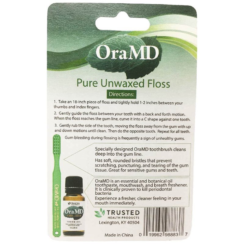 Dr. Charles C. Bass devoted 20 years of his life to developing this revolutionary toothbrush and brushing technique. The OraMD toothbrush has 3 rows of bristles, 6 tufts to a row, evenly spaced. The bristle length is 13/32 of an inch long and .007 inches in diameter. For best results, follow these directions exactly: Hold the OraMD Toothbrush at a 45-degree angle to your teeth and brush in a short, circular motion with the bristles penetrating the gum line as you brush. Apply firm but light pressure. This gentle sweeping action along the gum line will dislodge the soft material containing foreign particles. Brush the outer, inner, and chewing surfaces. You may experience slight bleeding for the first couple days as the OraMD toothbrush and brushing technique penetrates and cleans the gingival crevices. We recommend using OraMD as your powerful toothpaste and mouthwash alternative. OraMD Unwaxed Dental Floss is a safe addition to your oral hygiene routine! It works effectively to remove foreign particles and debris from between the teeth. Feel confident that our OraMD Unwaxed Dental Floss doesn't use any chemical or synthetic waxes or fragrances. Some dental floss manufacturers coat their products in a Teflon-like substance that contains highly toxic PFAs. One study found that women who flossed with a popular brand of floss had higher levels of a chemical called perfluorohexane sulfonic acid (PFHxS) in their blood than women who didn’t use that type of floss. These chemicals have been linked to liver damage, harm to the immune system, developmental issues, cancer, and can persist in people’s bodies and environment for many years. The wax used in conventional floss is often 20% paraffin wax and 80% microcrystalline which are both derived from petroleum. Microcrystalline waxes are derived from the refining of the heavy distillates from lubricant oil production.This by-product must then be de-oiled at a wax-refinery and then hydro-treated to remove odors.