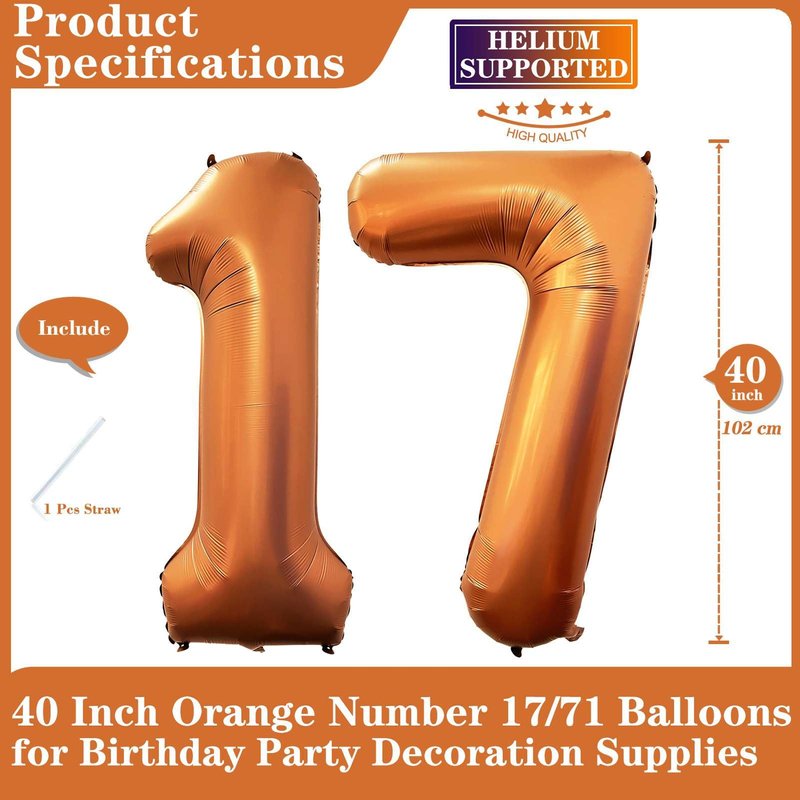 - 【Package Included】40 inch orange number 17 balloons (uninflated), 1 Pcs straw.
