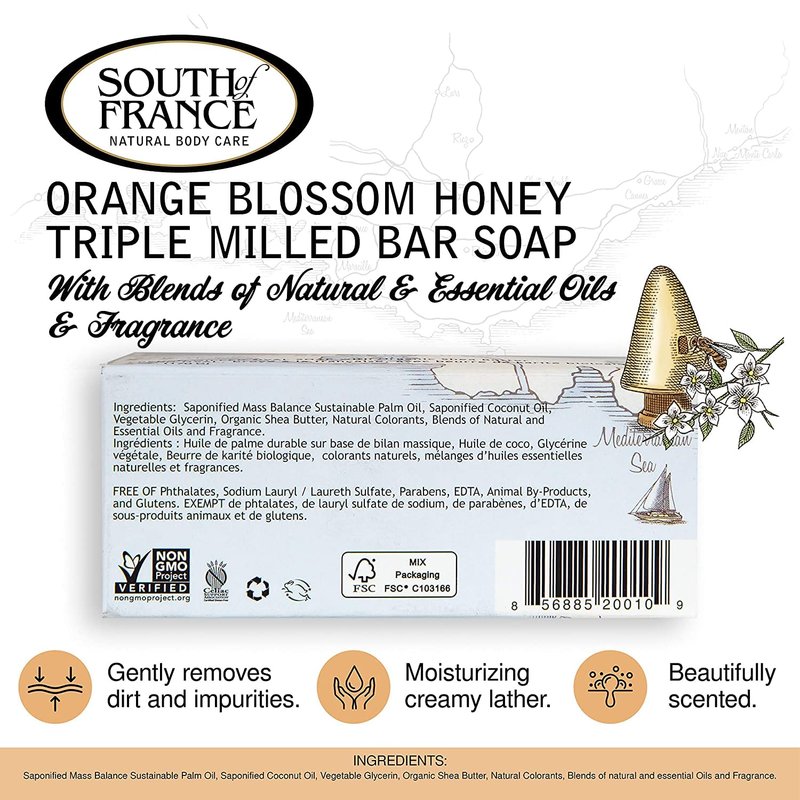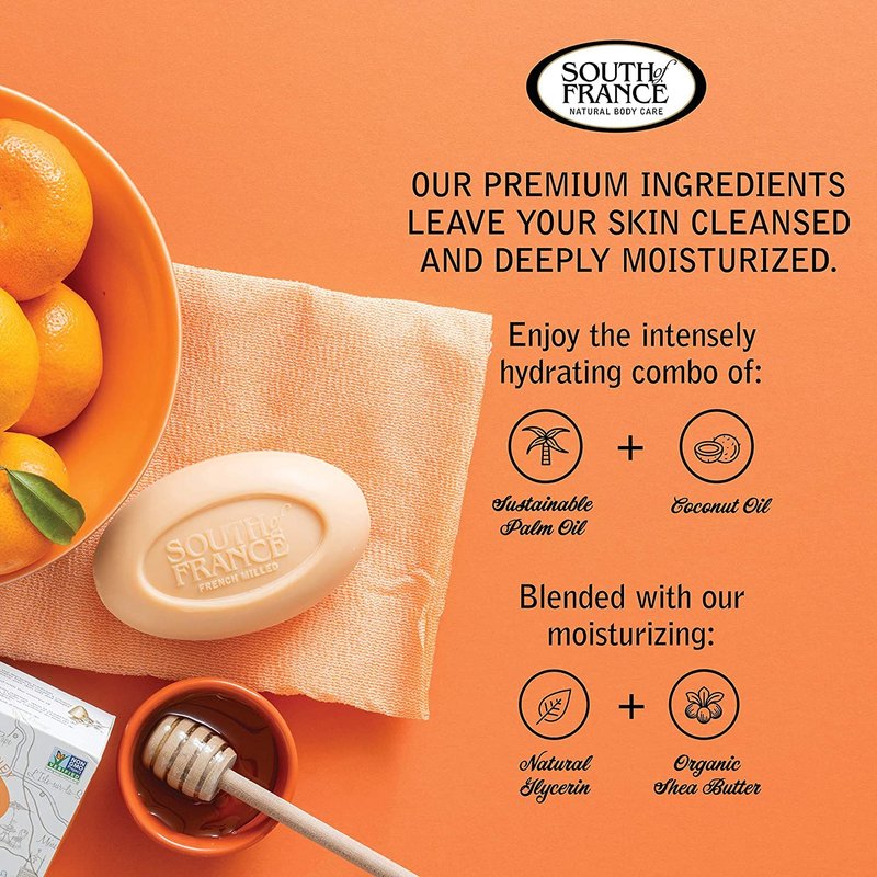 Orange Blossom Honey Clean Bar Soap by South of France Clean Body Care | Triple-Milled French Soap with Organic Shea Butter + Essential Oils | Non-GMO Body Soap | 6 oz Bar – 4 Pack - Infused with the floral sweetness of honey blended with intoxicating orange blooms. Make time for you, too. Work up an ultra-moisturizing lather for an all-over body clean with a delicious scent. This long-lasting, plant-based signature bar leaves skin soft and happy. Warnings: These statements have not been evaluated by the FDA. These products are not intended to diagnose, treat, cure, or prevent any disease.