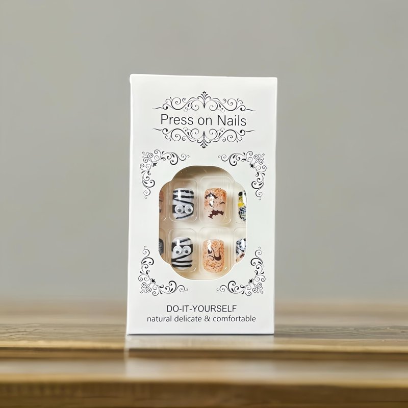 - Package Contains:A box contains 24 orange glitter Halloween mummy fake nails, a nail file and 24 jelly glues, an alcohol cotton pad,1 wooden stick,the fake nails are divided into 12 different sizes, it is convenient for you to choose the fake nails that suit your nail