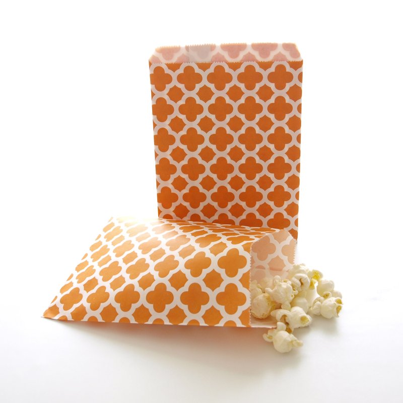 - Included in our Party Supply Goodie Orange Favor Bag Kit is 100 Paper Party Favor Bags - 25 Chevron, 25 Striped, 25 Spanish Tile & 25 Polka Dots, Each Bag Measuring 7.25" x 5.125"