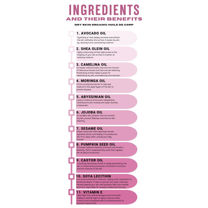 Our organic body oil for dry skin is a luscious infusion of nature's most hydrating and replenishing oils. Avocado oil, deeply hydrating, meets the moisture-locking power of Shea Olein oil, while Abyssinian oil restores elasticity. Jojoba oil and Sesame seed oil further nourish your skin with essential vitamins, leaving your dry skin not just moisturized but luxuriously revitalized. Let this indulgent blend become a daily ritual, transforming your skincare routine into a spa-like experience.