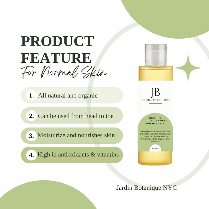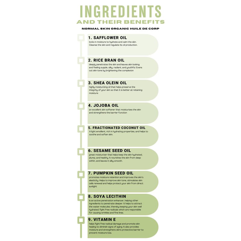 Indulge your normal skin in the luxurious care it deserves with our specially crafted organic body oil. The harmonious blend of nourishing Safflower oil, hydrating Jojoba, antioxidant-rich Rice Bran oil, and moisturizing Shea Olein Oil creates a symphony of benefits. Safflower oil and Jojoba, packed with essential fatty acids, deeply hydrate, while Rice Bran oil and Shea Olein Oil provide antioxidants that protect your skin from environmental stressors. This lightweight formula is a perfect daily indulgence, leaving your normal skin feeling not just cared for, but truly pampered.
