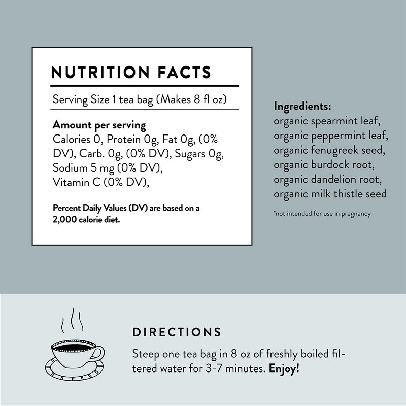- Ingredients: organic spearmint, organic peppermint, organic fenugreek seed, organic burdock root, organic dandelion root and organic milk thistle
