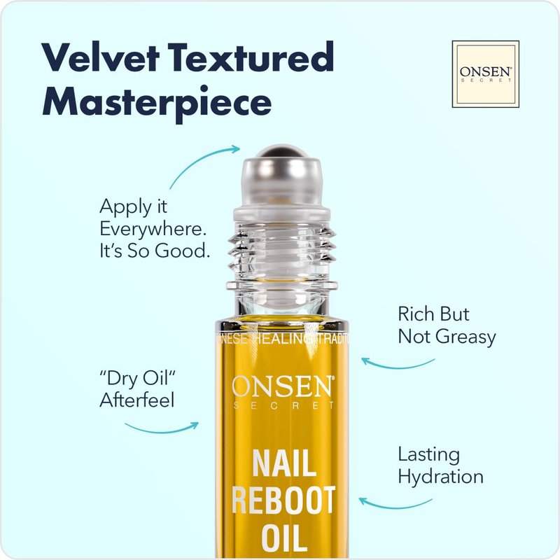 Onsen Secret Nail Reboot Oil – your ultimate companion to stronger, healthier nails and cuticles! Our fast-absorbing formula delivers essential hydration and nourishment, revitalizing your nail bed from within. Say goodbye to peeling, breaking, and splitting nails. You'll witness a remarkable difference by incorporating just a few drops of our rejuvenating oil into your daily routine. Our Nail and Cuticle Oil Serum is enriched with a blend of pure, organic, unrefined, cold-pressed virgin oils, including Japanese Tsubaki, Castor, Tea Tree, Jojoba, Rosehip, Rice Bran, and Olive. This powerful infusion offers an unparalleled experience in nail and cuticle care. Experience the luxurious texture of each drop – velvety and non-greasy, ensuring a comfortable application. You'll feel the Nail Reboot working its magic for hours on end.