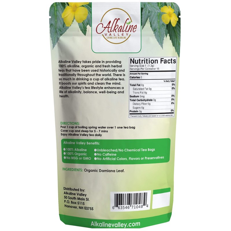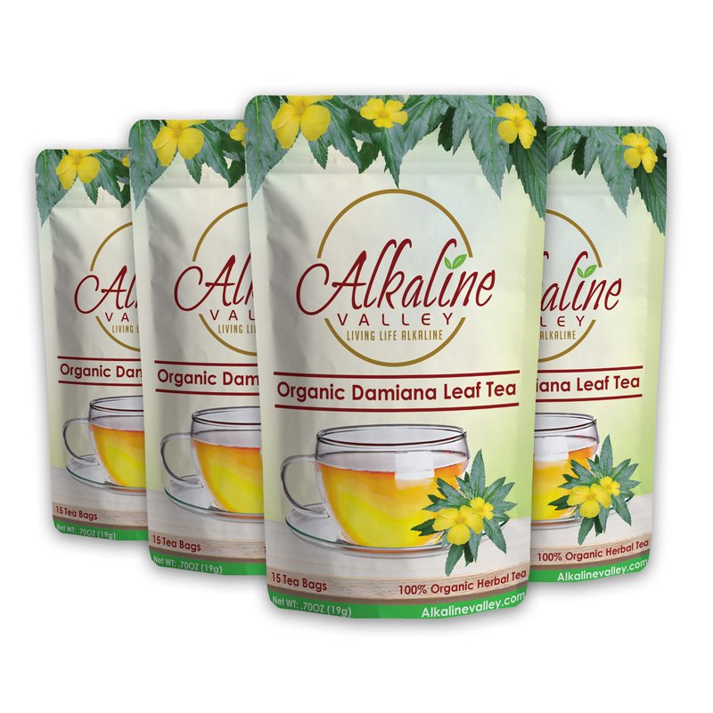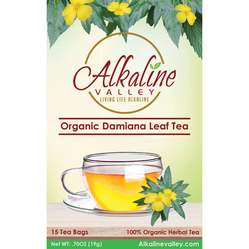 The leaves of organic damiana herb makes an excellent herbal tea. Damiana is a small bright yellow flower that grow in warm regions throughout Mexico and South and Central America. Damiana leaf tea is a great beverage choice because of its many essential nutrients. The herbal tea has important antioxidants and boosts the body’s supply of minerals, such as iron, magnesium, potassium, selenium and zinc. Alkaline Valley also sells these organic herbal teas: burdock root, nettle leaf tea, red clover, red raspberry leaf tea, ginger tea, fennel seed tea, elderberry, dandelion leaf anise seed tea, and allspice.
