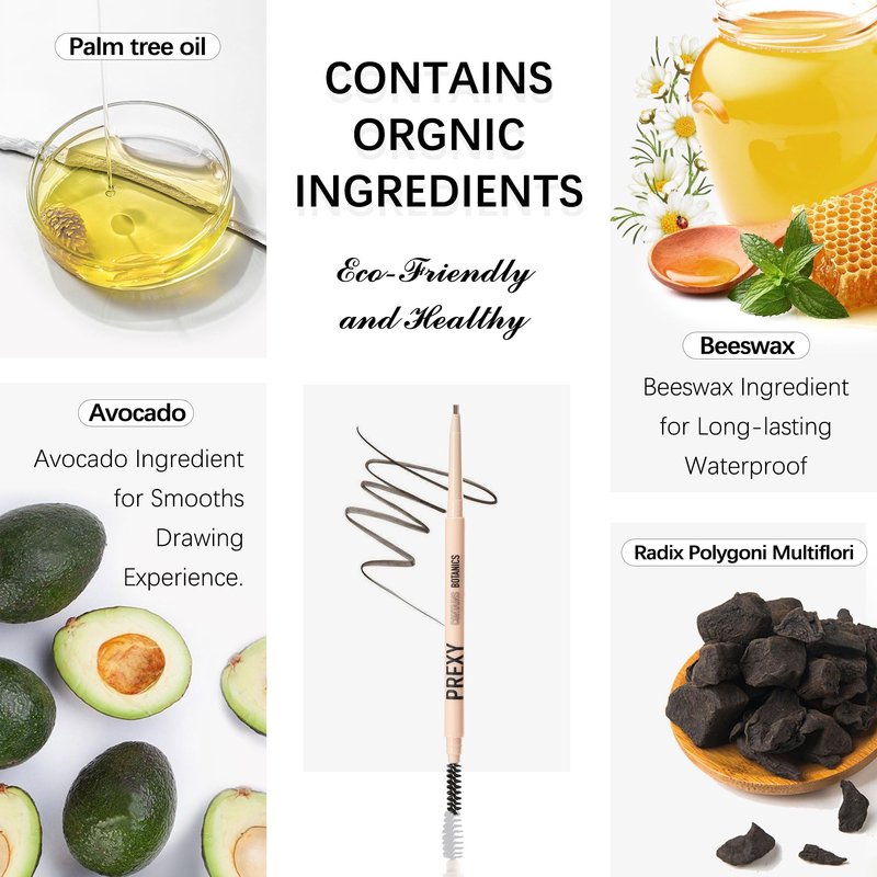 - 【Natural and Eco-Friendly Eyebrow Pencil with Organic Ingredients】Our eyebrow pencil is made of natural and organic formula that includes a variety of organic ingredients, such as avocado, palm tree oil, Radix Polygoni Multiflori, and beeswax. These organic ingredients provide a smooth drawing experience while also offering waterproof and long-lasting effects. We are currently developing an improved recipe.