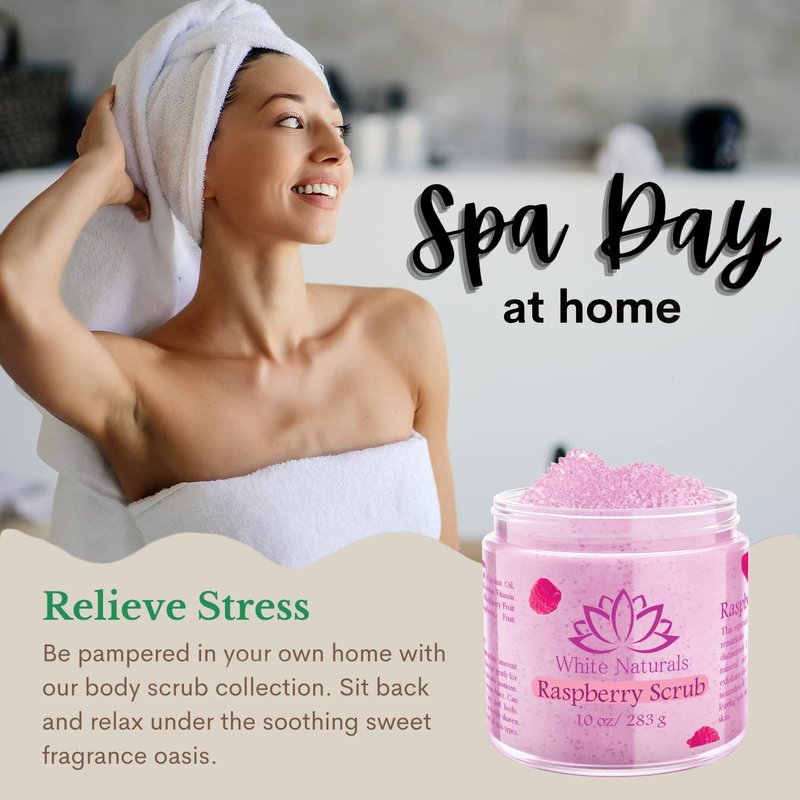 - RELAXING EFFECT: Our exfoliating Raspberry scrub has a lovely texture and a subtle that can help you relax and enjoy a real SPA experience in the comfort of your home. Our exfoliant body scrub comes in a 10oz jar with a lid that makes it super easy to apply.