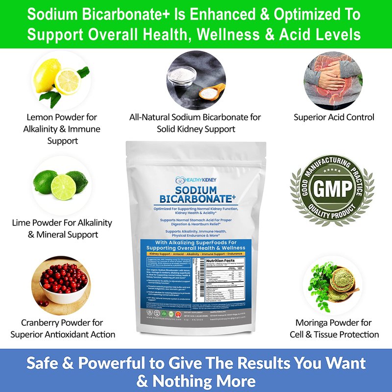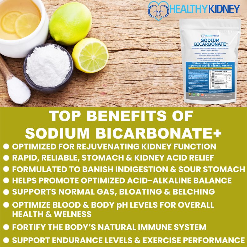 - Our natural organic use Sodium Bicarbonate+ powder alkaline supplement with alkalizing superfoods designed to support normal kidney function & kidney health. Safe fast acting antacid for the stomach, an electrolyte which alkalizes & buffers acid for supporting immune health, sports performance & more. Rejuvenate kidney health, support normal elimination of kidney & body acid, stop the burning, acid indigestion, sour stomach w/ this unique organic use sodium bicarbonate.