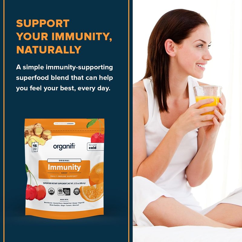 Organifi Immunity - Organic Superfood Immunity Support - 15 Single Serve Packets - Immunity Powder for T Cell Production and Upper Respiratory Health - Mushroom Beta Glucans, Vitamin C, D and Zinc