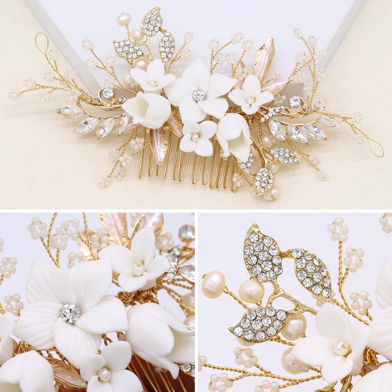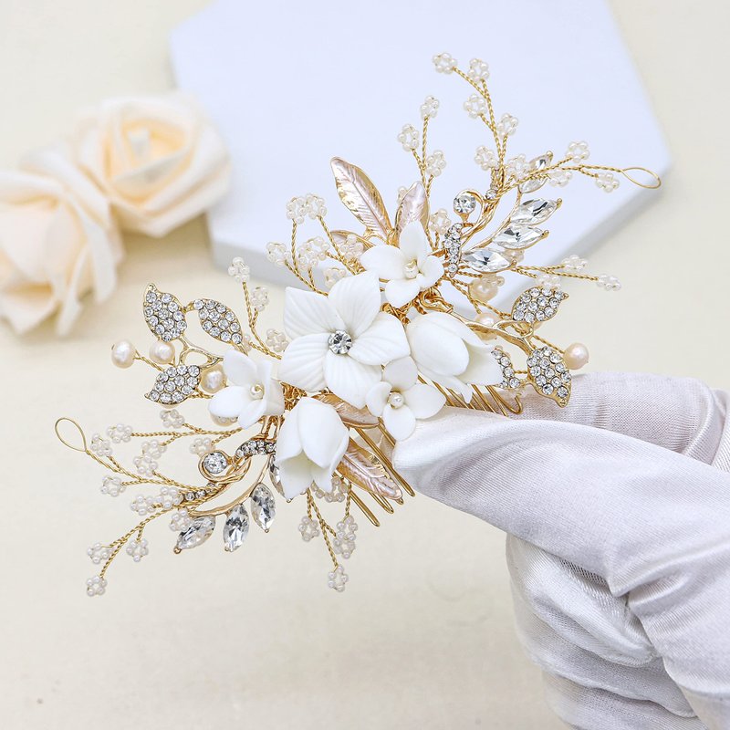 Oriamour Bridal Hair Comb For Brides Ceramic Flower Side Comb Hair Clip For Women Hair Accessories for Brides (Gold)