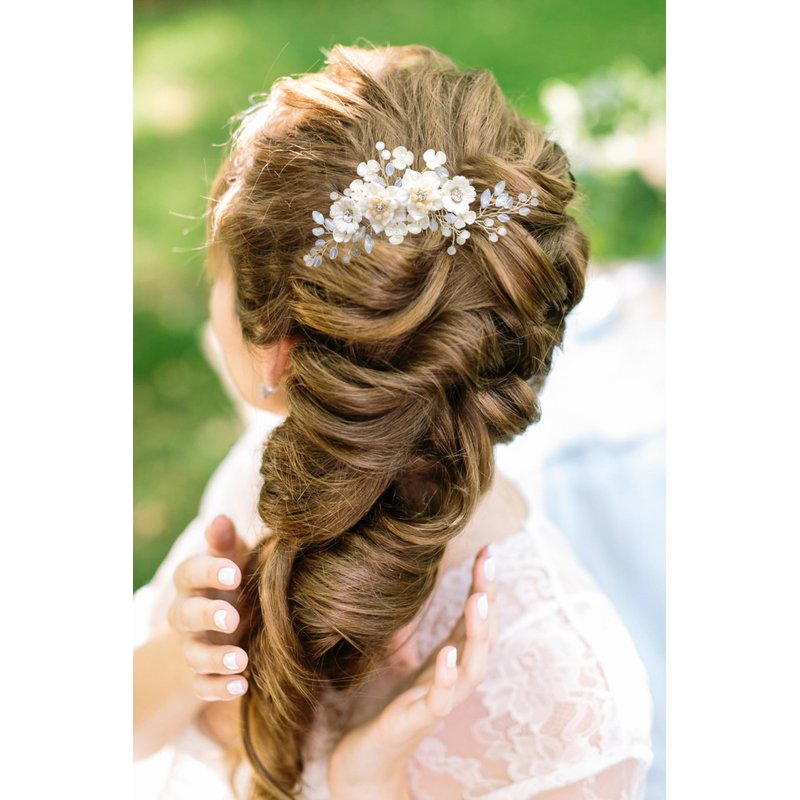 - Elegant Design: This bridal hair comb is an exquisite accessory that exudes elegance and sophistication. The delicate ceramic flowers and marquise-shaped rhinestones together create an eye-catching design that will elevate any bridal ensemble.