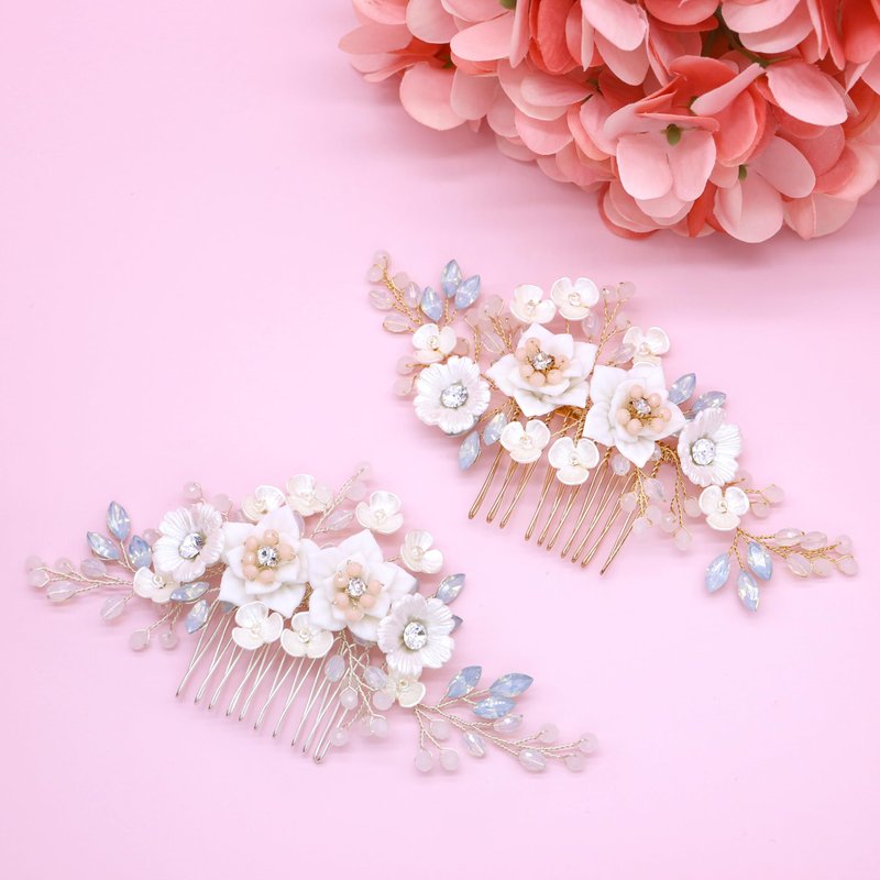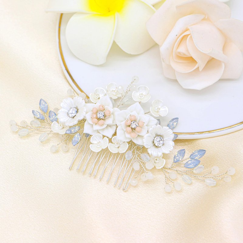 Experience the epitome of elegance with our Bridal Hair Comb, a perfect accessory to elevate your special day. Intricately designed with delicate ceramic flowers and sparkling marquise-cut rhinestones, this hair comb exudes sophistication and high fashion. Crafted with high-quality materials, the ceramic flowers exhibit a stunning aesthetic appeal and durability, while the marquise-cut rhinestones add a radiant sparkle that complements any hairdo. Each detail is carefully constructed to provide an accessory that is as durable as it is beautiful. The hair comb is designed with versatility in mind. It's the perfect accessory not only for the bride but also for bridesmaids, flower girls, or any member of the bridal party. Whether it's a wedding, prom, party, or photo shoot, this hair comb adds a touch of elegance and charm to any occasion. This hair comb is designed for a comfortable and secure fit. It easily slides into any hair type or style, ensuring it stays securely in place throughout your event. Beyond being a stunning accessory, this bridal hair comb serves as a memorable keepsake from your special day. Its timeless design and quality craftsmanship ensure it will retain its beauty, offering you a cherished memento of your special occasion for years to come. This hair comb is more than just an accessory; it's a statement of style, elegance, and memorable moments.