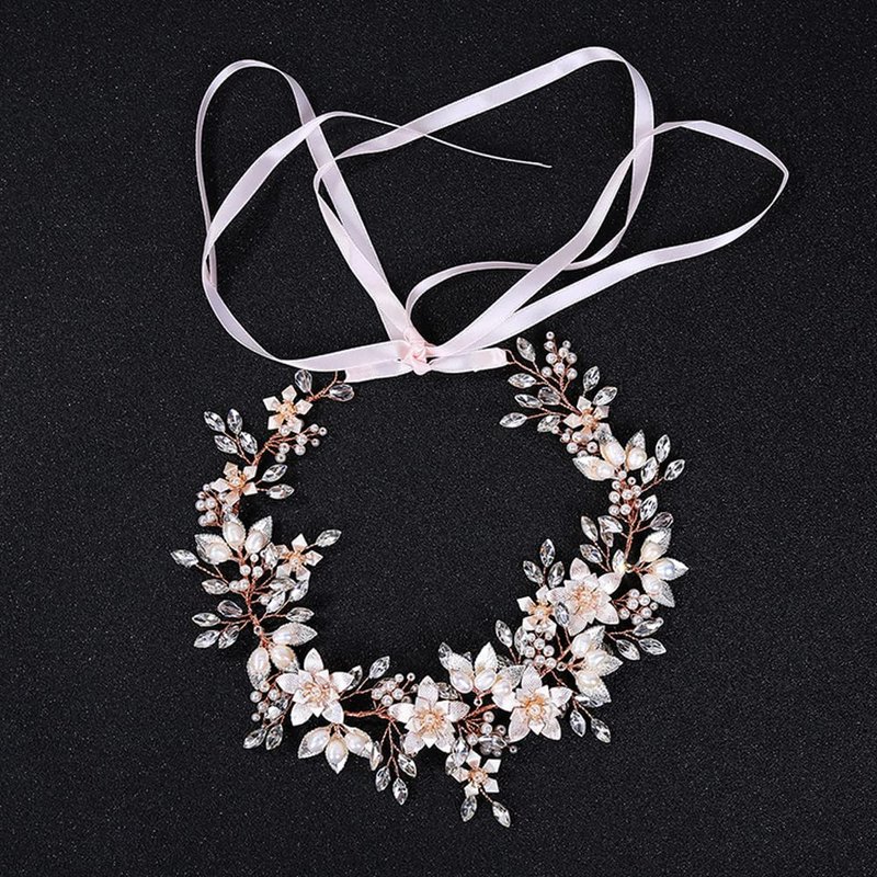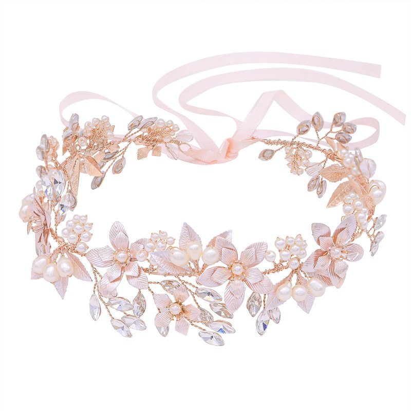 Oriamour Wedding Headband Bridal Headpiece Flower Design With Genuine Freshwater Pearls And Ribbons Hair Accessories For Bride (Rose Gold)
